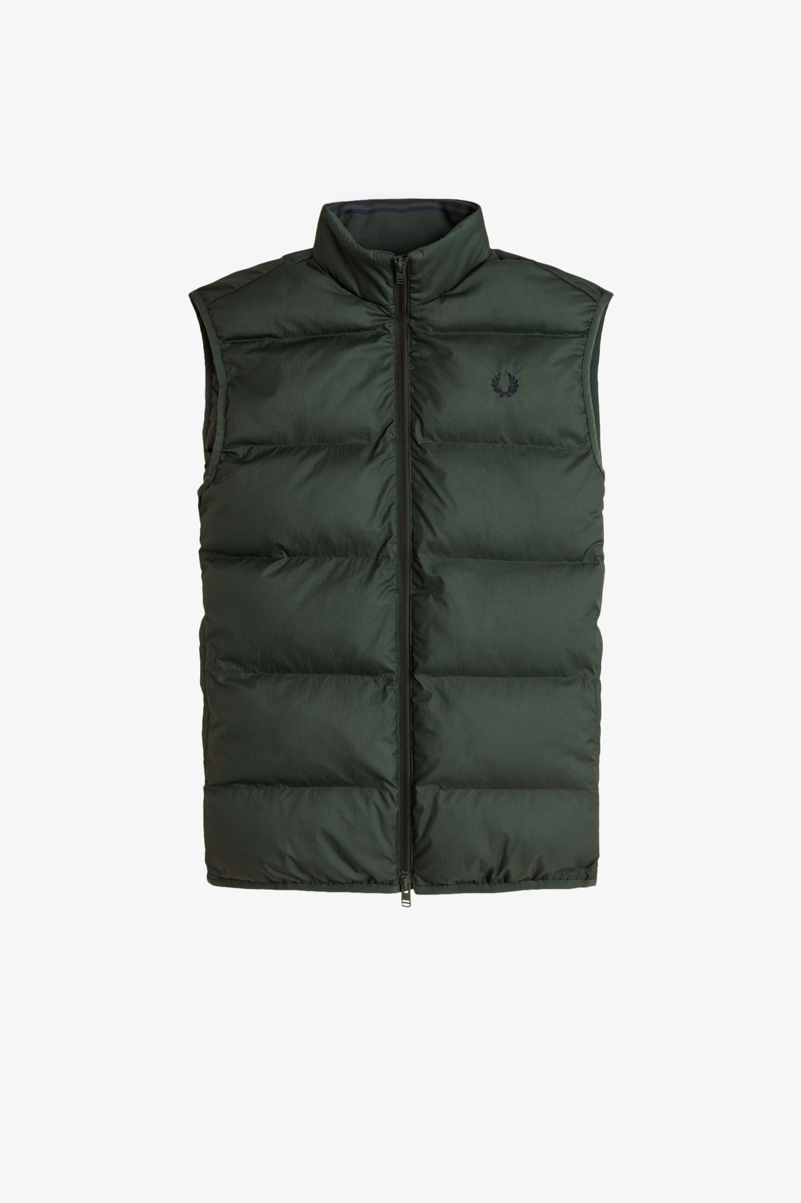 Elegante, isolierte Weste ist aus vollständig recyceltem Ripstop-Nylongewebe gefertigt und mit  gestickten Fred perry Lorbeerkranz versehen.